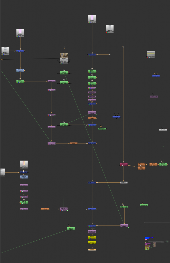 This Nuke workflow is built around a planar-tracked shot, where the main plate is first stabilized using a planar track and then processed through a series of roto, transforms, and merges to integrate multiple elements seamlessly. The planar track drives corner pin and transform nodes, allowing inserted graphics and textures to lock naturally to the surface while maintaining perspective and parallax. Roto nodes are used to isolate specific areas for masking and cleanup, with glows and color operations added to enhance integration. Multiple merge chains composite the tracked elements back over the original plate, while premultiplication and alpha management ensure clean edges. Finally, subtle blurs and lens effects help match the original footage, resulting in a cohesive composite that follows the planar motion of the shot accurately.