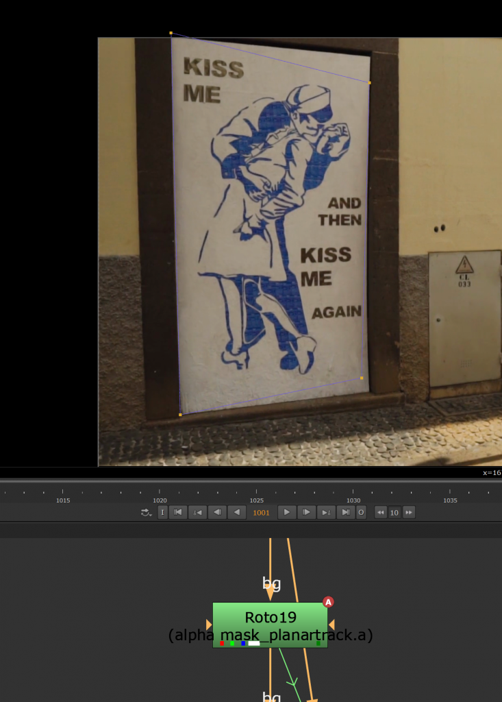 In this composite, a planar track is used to lock the artwork accurately onto the wall surface, with a roto shape defining the exact screen/poster area. The planar track provides stable corner pin data, ensuring the element follows the perspective, scale, and motion of the shot, while the roto refines the edges and masks out unwanted areas. This combination allows the inserted graphic to sit naturally within the frame, preserving surface distortion and camera movement. Final integration is achieved through careful blending, color matching, and subtle texture retention, making the composited element feel like it was originally part of the environment.